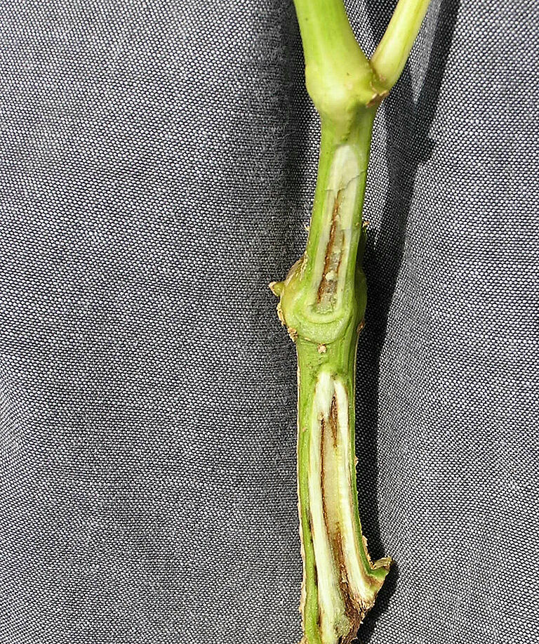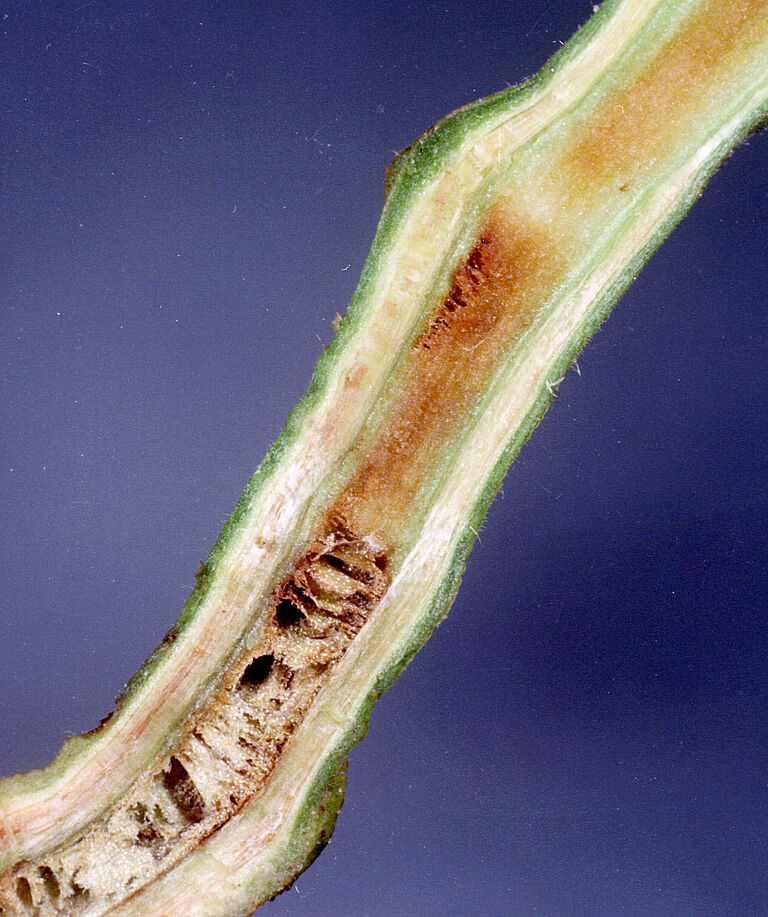 На растениях томата сначала заболевают самые молодые листья. Они проявляют признаки увядания в течение дня, которые могут исчезнуть на ранних стадиях заражения. В условиях, благоприятных для развития бактерий, все растение увядает вскоре после появления первых симптомов. При более благоприятных для развития болезни условиях растения могут проявлять признаки задержки роста и формировать много придаточных корней на стебле. Сосудистая ткань ствола окрашена в коричневый цвет, и, если сделать на стебле надрез, из него вытекает бактериальная слизь. Таким образом болезнь можно отличить от вилтов Verticillium или Fusarium.