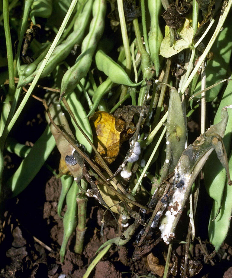 Первыми симптомами заражения белой гнилью (Sclerotinia sclerotiorum) являются водянистые повреждения в основании стебля. Растение над ними увядает и загнивает. На поврежденных участках прорастает белый, пушистый грибной мицелий, которому болезнь обязана своим названием. В мицелии образуются большие, темные склероции. Они напоминают крысиный помет и видны невооруженным глазом. Симптомы могут возникать на стеблях, а также на листьях, плодах и стручках.