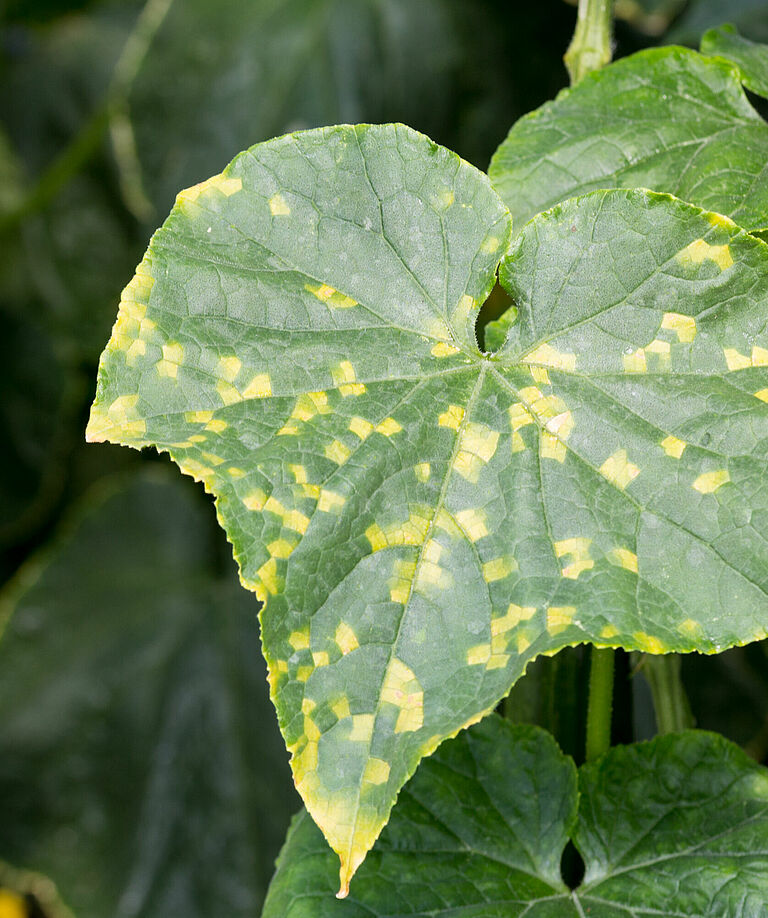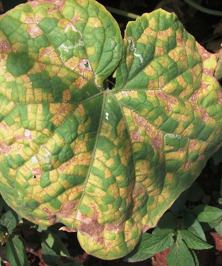 Патогены ложной мучнистой росы заражают, главным образом, листья, но иногда им бывают подвержены также стебли и плоды. Они вызывают образование поврежденных участков на верхней поверхности листа, окаймленных жилками, которые сначала желтеют, а затем становятся коричневыми. На нижней стороне листа появляется пушок, сначала белый, а затем серо-коричневый. Это споруляция патогенов, выступающая из устьиц.