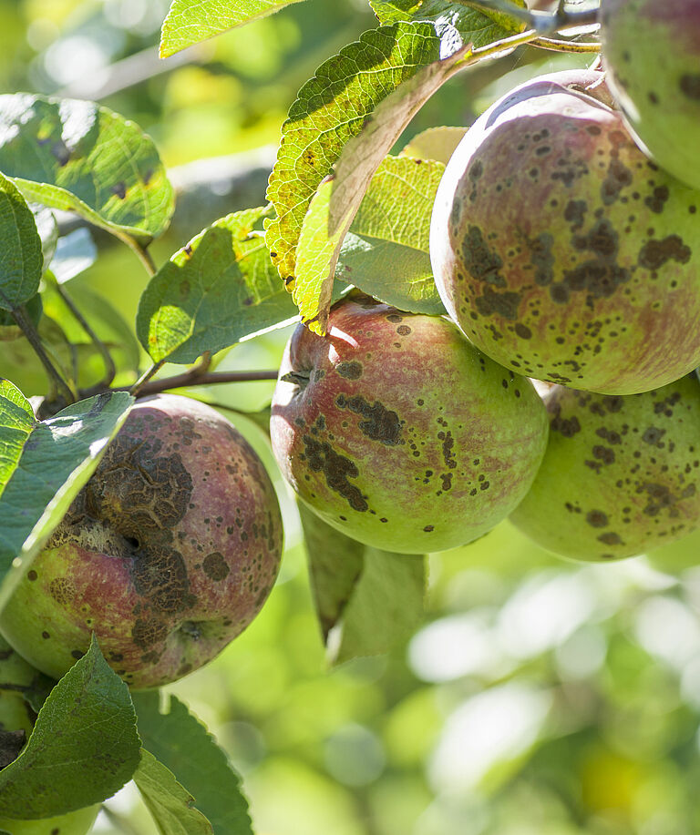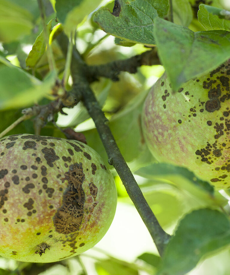 Venturia inaequalis зимует как незрелые плодовые тела в зараженных опавших листьях или в пораженных участках на побегах. Эти незрелые плодовые тела или псевдотеции созревают зимой и образуют аскоспоры. В зависимости от температуры эти аскоспоры созревают и высвобождаются, когда становятся влажными. Аскоспоры рассеиваются ветром и попадают на плодовые деревья, где прорастают при наличии свободной воды. Они заражают растение, проникая прямо в кутикулы, а затем прорастают между кутикулой и эпидермисом растительных клеток. Это вызывает образование поврежденных участков, на которых образуются конидиеносцы, структуры, несущие конидии, которые проходят через кутикулу. Выделяются бесполые конидии и повторяют цикл заражения на новых частях растения, а также производят споры. Осенью грибок производит новую псевдотецию в листьях, уже опавших с дерева.