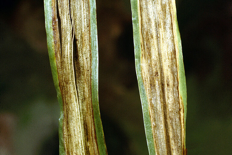 Сначала симптомы возникают на первом, втором и третьем, а затем на других листьях. У основания листа и на листовой оболочке формируются желтые полосы. Они постепенно расширяются и становятся коричневыми и хлоротическими и могут сливаться. В конечном итоге это приводит к гибели листа. Лист трескается на конце, из-за чего он выглядит рваным. Это является характерным признаком болезни.
