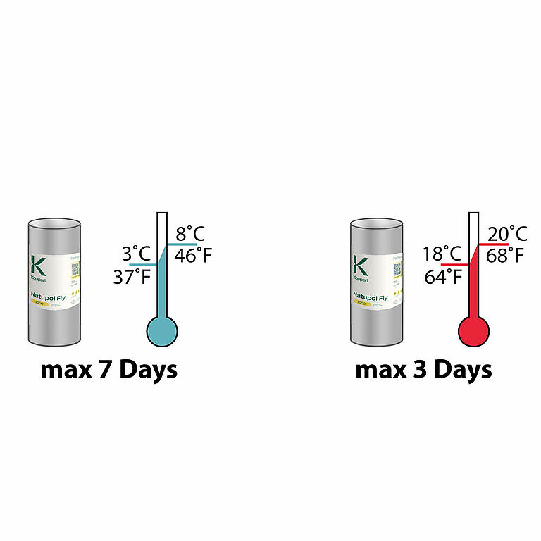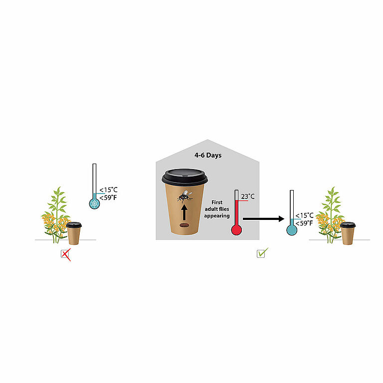 Не выпускайте Natupol Fly без подготовки при температуре ниже 15 °C. Результат будет непредсказуемым, и часто процесс занимает больше недели. В случае необходимости использования Natupol Fly при температуре ниже 15 °C сначала дайте им созреть в теплой среде. Выпускайте Natupol Fly после появления первых взрослых мух.