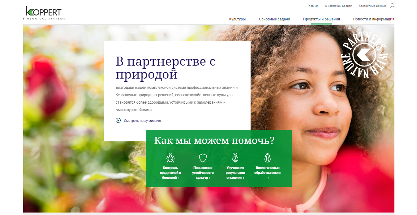 Кроме нового внешнего вида, мы добавили разделы с доступной и понятной информацией о средствах биологической защиты, опылении, вредителях и болезнях растений и почвы. Теперь сайт может стать для вас настоящей энциклопедией, наполненной знаниями, накопленными Копперт и специалистами сельского хозяйства за прошедшие 50 лет. Мы верим, что обмен этими знаниями играет важную роль в достижении устойчивого роста отраслей сельского хозяйства и садоводческого сектора, который достигается только в партнерстве с природой.