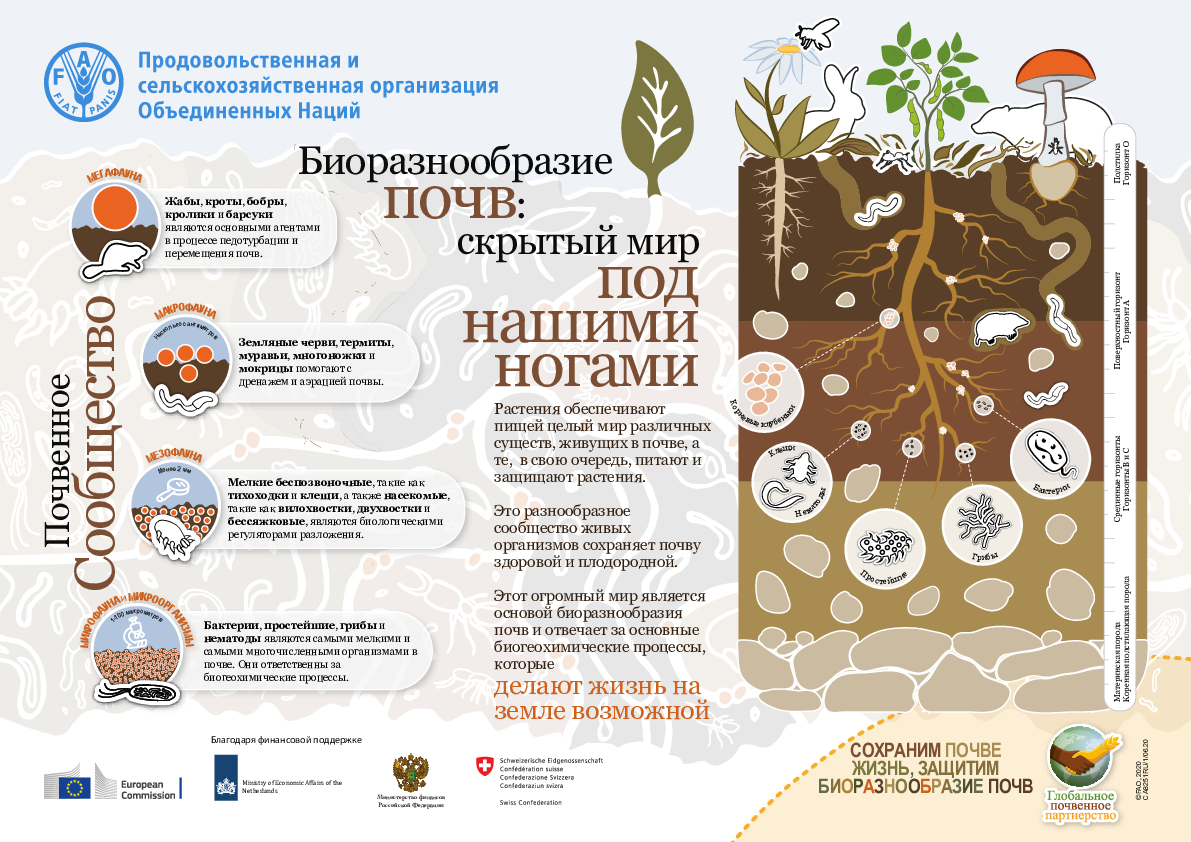 Всемирный день почв 2020 и его слоган «Сохраните жизнь почвы - защищайте биоразнообразие нашей планеты» нацелены на повышение осведомленности населения о важности поддержания здоровья экосистем, способах решения растущих проблем в области распоряжения ресурсами, борьбой с утратой биоразнообразия почв и призыв к активным действиям по улучшению здоровья почвы.