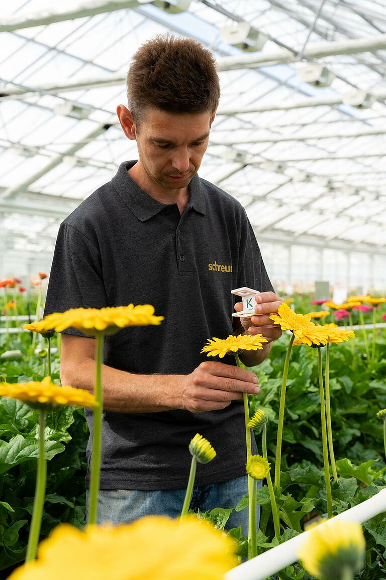 Анри Вольгеринг, скаут компании Schreurs, объясняет: "Скаутинг очень важен в этой отрасли. Поэтому мы не только проводим еженедельный подсчет всех липких ловушек, но и привлекаем всех, кто работает в теплице, чтобы они были бдительны в отношении таких вредителей, как луковый трипс(Thrips tabaci), тепличная белокрылка(Trialeurodes vaporariorum) и южноевропейская болотная пиралида(Duponchelia fovealis). Мы стремимся действовать на опережение, если потребуется вмешательство".