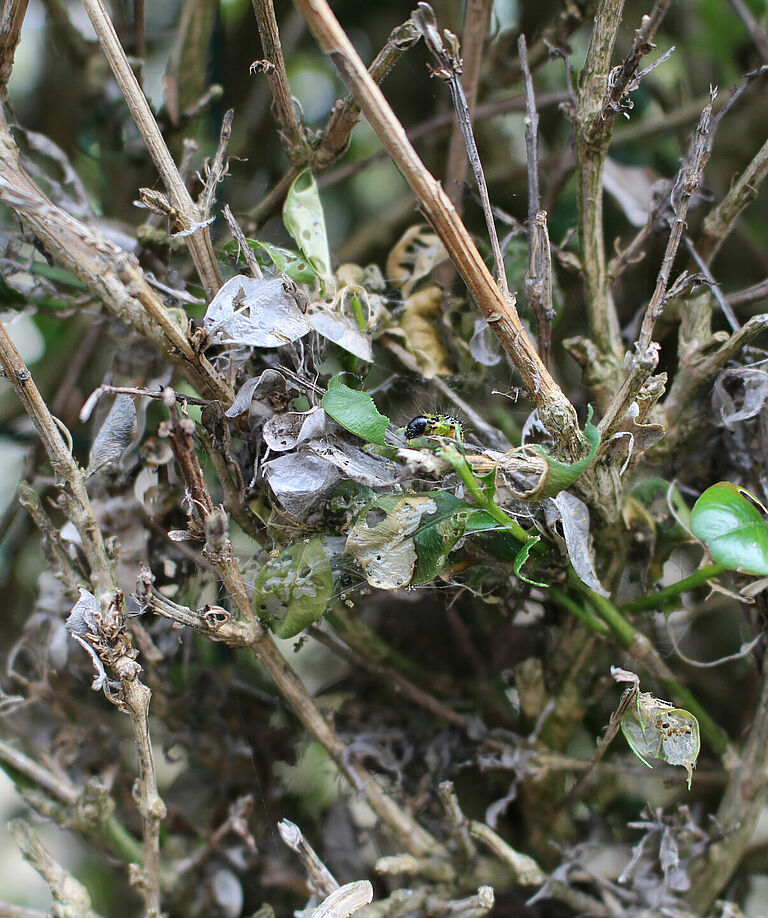 Самка огневки самшитовой (Cydalima perspectalis) откладывает на листьях самшита яйца. Яйцекладка состоит из 5–20 яиц в полупрозрачной желеобразной массе. У светло-зеленых гусениц с черной головой имеются черные полосы с белыми точками и волосками. В зависимости от условий окружающей среды, таких как продолжительность дня, температура и источник пищи, гусеницы проходят через пять-семь возрастных стадий. Куколки скрыты между листьями, и их трудно обнаружить. Они окрашены в зеленый цвет с коричневыми продольными линиями в начале окукливания, а затем становятся светло-коричневыми с темным рисунком к концу окукливания. Существует два возможных окраса взрослых особей. Самый распространенный — радужный белый с темно-коричневой полосой на внешнем крае и характерным белым пятном на передних крыльях, другой — светло-коричневый, с белым пятном на передних крыльях. Взрослые бабочки отлично летают. В дневное время они отдыхают на самшите или других окружающих растениях. У огневки самшитовой (Cydalima perspectalis) наблюдается обязательная диапауза в шесть или восемь недель. В зависимости от продолжительности дня они могут входить в диапаузу на четвертой или пятой возрастной стадии.