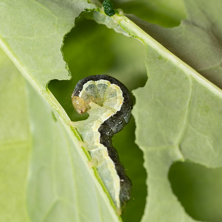 Крупные гусеницы питаются главным образом молодыми листьями, вызывая их скелетонирование и оставляя на листьях дыры и буровую муку. Гусеницы уничтожают большое количество листьев, а их буровая мука накапливается в сердцевине капусты, снижая коммерческую ценность зараженной культуры.