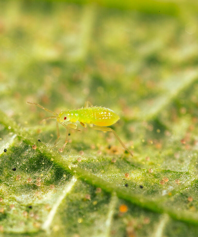 Macrolophus pygmaeus - ключевой хищный жук для биологического контроля белокрылки, Tuta absoluta и спидовых клещей. Это полезное насекомое широко используется в программах интегрированной борьбы с вредителями (IPM) на томатах. Взрослые особи Macrolophus pygmaeus - это маленькие, стройные хищные жуки с характерными черными отметинами, а нимфы - бледно-зеленые с красными глазами. И взрослые особи, и нимфы - прожорливые хищники, способные питаться различными видами вредителей. Благодаря своей эффективности в борьбе с вредителями и минимальному воздействию на нецелевые организмы, естественный враг Macrolophus pygmaeus предлагает производителям устойчивое и экологически безопасное решение для борьбы с популяциями насекомых-вредителей.